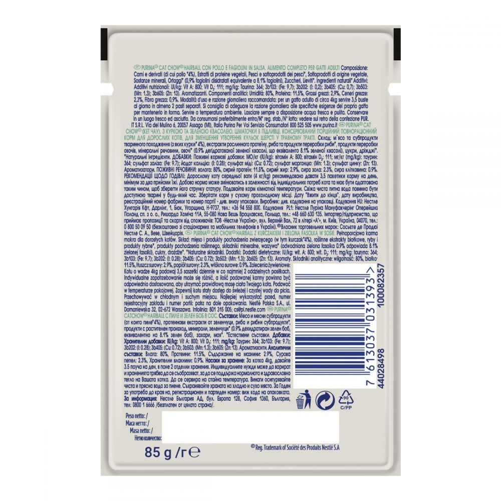 Вологий корм для котів для зменшення утворення кульок шерсті в травному тракті Cat Chow (Кет Чау) Hairball Control містить усе необхідне, щоб ваш улюбленець мав повноцінне та здорове життя.Переваги:допомагає мінімізувати утворення кульок шерсті в травній системіна 100 повнораціонний і збалансованийдо складу входить якісний протеїн і натуральні інгредієнтибез доданих штучних консервантів і барвників