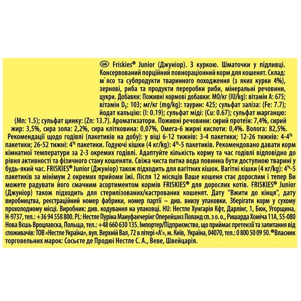 Вологий корм для кошенят Friskies (Фріскес), з куркою в підливі - повнораціонний і збалансований корм для домашніх улюбленців.Переваги:дає кошеняті всі необхідні поживні речовини, щоб забезпечити плавний перехід від материнського молока до твердої їжіприродний захист завдяки вітамінамздоровий розвиток завдяки білку високої якостіздорові зуби та кістки завдяки вітамінам і мінераламздоровя серця та гарний зір