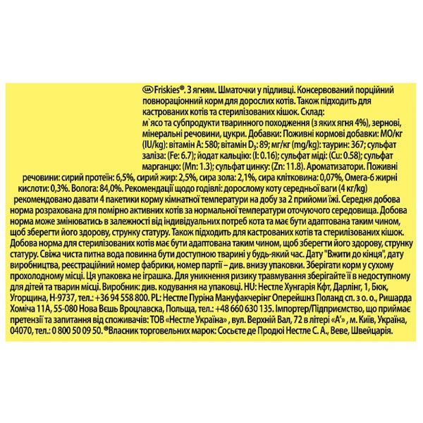 Вологий корм для котів Friskies (Фріскес), з ягням у підливі - повнораціонний і збалансований корм для домашніх улюбленців.Переваги:зроблений з інгредієнтів добірної якостісмачні та якісні шматочки в соусі сподобаються вашому коту