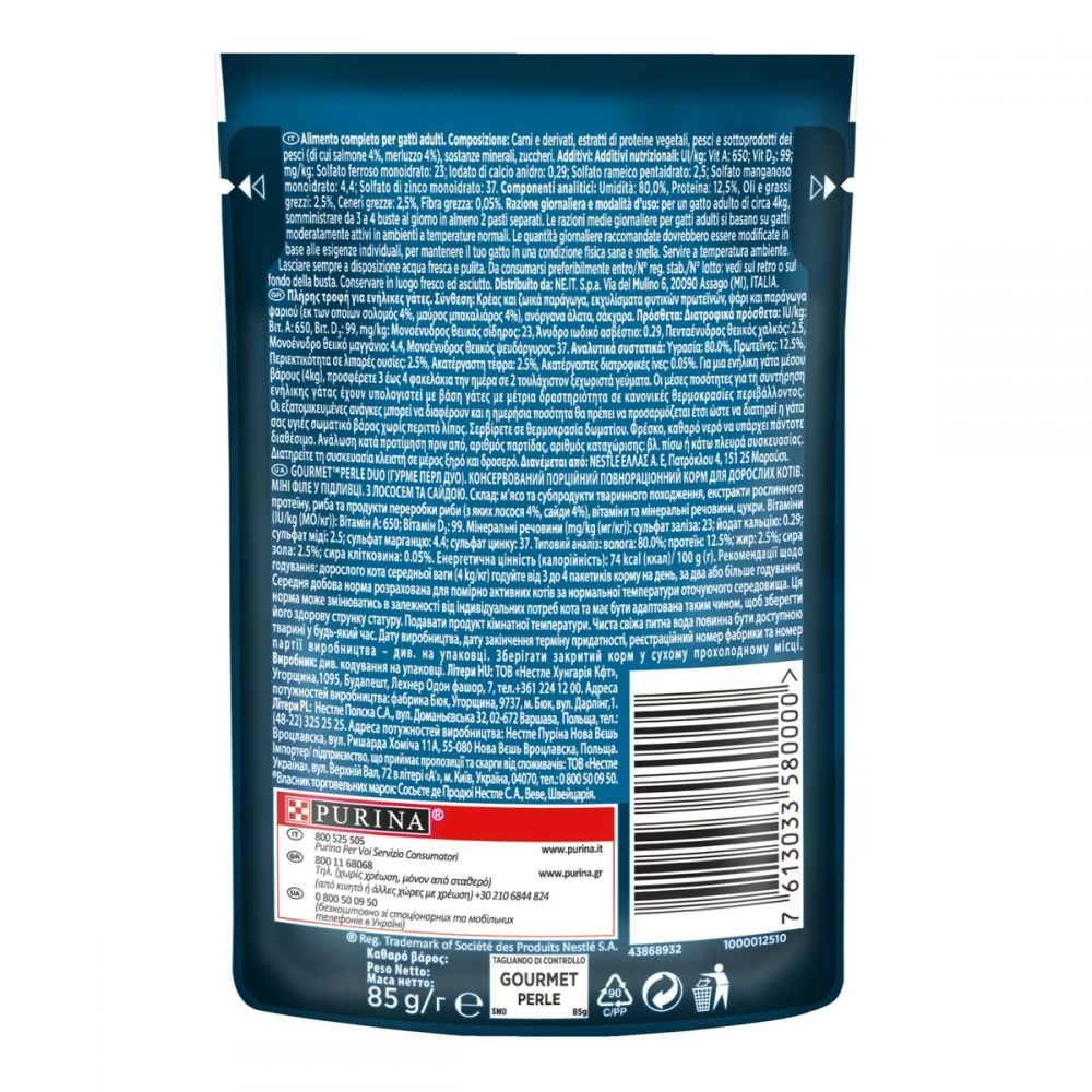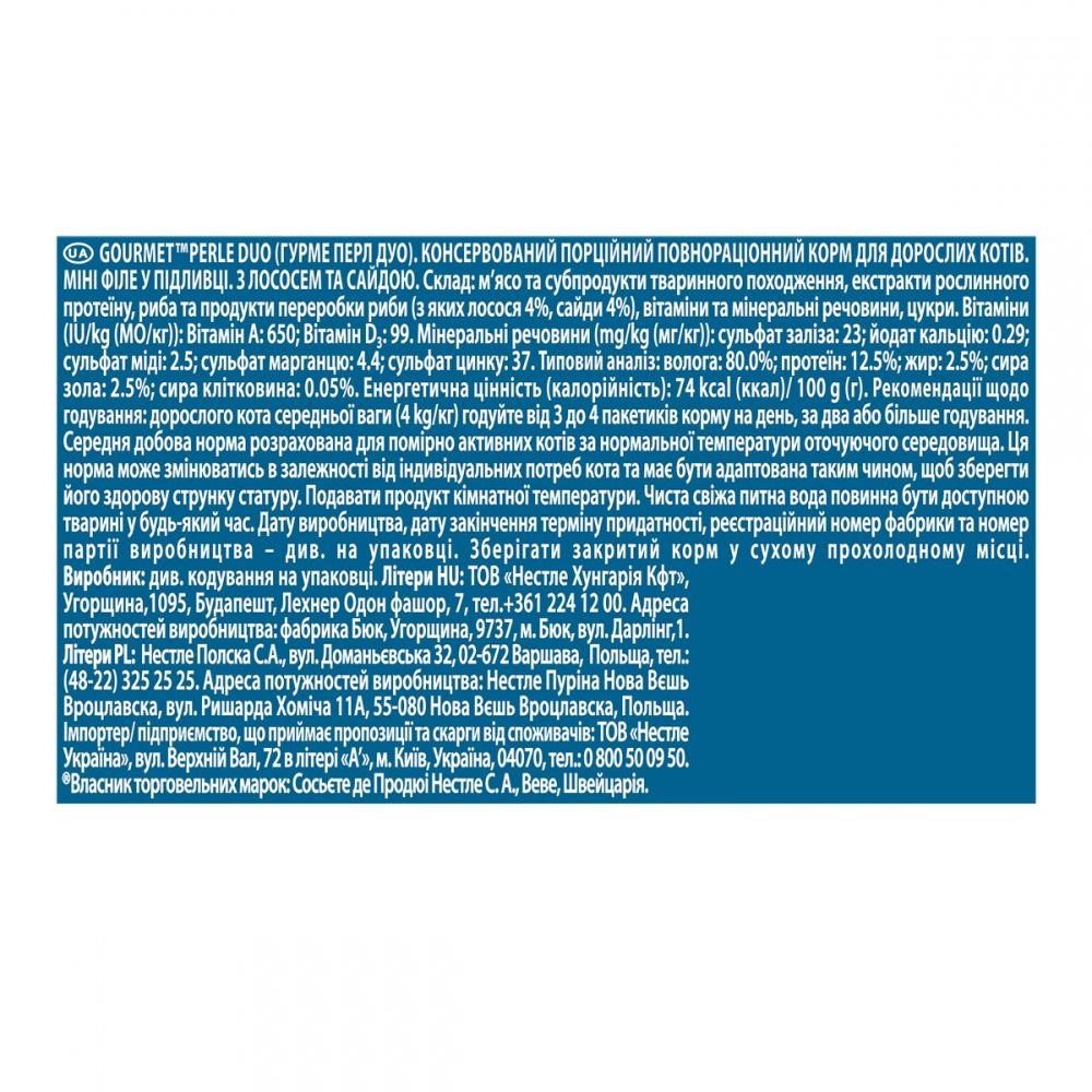 Gourmet Perle (Павуч) консерви для кішок міні філе в підливі з лососем і сайдоюВологий повнораціонний корм для дорослих кішок міні філе в підливі з лососем і сайдою. Приготований з добірного натурального мяса. Містять якісні білки, вітаміни, мінерали та інші смачні і корисні компоненти.Склад:мясо та субпродукти тваринного походження, екстракти рослинного протеїну, риба та продукти переробки риби (з яких лосося 4, сайди 4), вітаміни та мінеральні речовини, цукри.Аналітичний склад кількістьБілок 12,5 Жир 2,5 Сира зола 2,5 Сира клітковина 0,05 Вологість 80.0 Добаленние речовини Кількістьвітамін А 650 МО кгвітамін D3 99 МО кгСульфат заліза 23.0 мг кгКальцію йодат 0,29 мг кгМіді сульфат 2,5 мг кгСульфат марганцю 4,4 мг кгЦинку сульфат 37,0 мг кгРекомендації по годівлі:При згодовуванні корму необхідно забезпечити постійний і безперешкодний доступ тварин до питної водиВага кішки Добова норма паучдень4 кг 3 - 4 пауч
