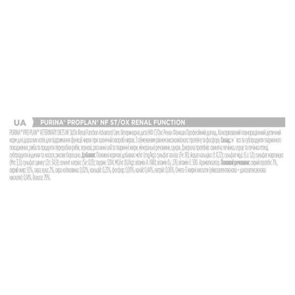 Вологий корм Purina Pro Plan Veterinary Diets (Пуріна Про План Ветеринарі Дієтс) NF Renal Function розроблений для дорослих і літніх котів із нирковою недостатністю.Переваги:повнораціонний дієтичний корммає високу смакову привабливістьсклад з обмеженим вмістом високоякісного білка і фосфорукорм сприяє компенсації порушеної здатності нирок регулювати вміст мінералів в організмізнижує запальні явища і підтримання рН сечі на рівніСклад:мясо, продукти переробки мяса, олії та жири, злаки, мінеральні речовини, згущувачі, амінокислоти, цукри, вітаміни, консерванти, барвники, антиоксиданти, добавки на 1 кг: вітамін А 37000 МО, вітамін D3 1200 МО, вітамін Е 650 МО, залізо 120 мг, йод 2 мг, мідь 12 мг, марганець 36, цинк 120 мг, селен 0,11 мг. Джерела білка: свиняча печінка, індичка, серце та печінка свійської птиці, рисове борошно.