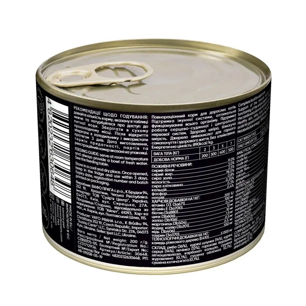 ОписБеззерновий збалансований вологий корм із рибою для дорослих котів. Повноцінне натуральне харчування, створене для забезпечення турботи про здоровя Вашого чотирилапого друга та задоволення потреб організму в поживних речовинах, вітамінах і мікроелементах.Типовий аналізКомпонентВмістбілки9жири3зола2,5клітковина0,8вологість78калорійність89 ккал100гркальцій0,25фосфор0,3вітамін D3200 МОвітамін E100 мгСкладРиба (36), курячі шлунки (14), курячі серця (14), печінка (12), горохове борошно, лігноцелюлоза, карбонат кальцію, сушена журавлина (0,1), сушена обліпиха (0,1), сушена котяча мята (0,1). Вітаміни та добавки: Вітамін D3 200 МО, Вітамін Е 100 мг, біотин 0,2 мг, цинк 12 мг, залізо 10 мг, марганець 1,5 мг, йодид калію 0,5 мг, мідь 0,5 мг, таурин 550 мг .