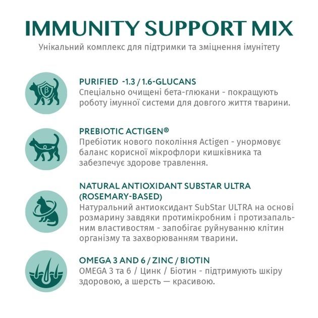 (UA) OPTIMEAL. Повнораціонний сухий корм для дорослих котів куркаЗбагачений білками, мінералами і вітамінами для максимального задоволення потреб кота. Зміцнює імунітет. Очищає зубиСпеціальна форма і текстура гранул сприяють очищенню зубів котаСвіже мясо курки у вигляді фаршу забезпечує кота високоякісним легкозасвоюваним протеїном тваринного походження, що сприяє здоровому травленнюМістить комплекс для зміцнення імунітету Immunity Support Mix, корисні трави, ягоди, натуральні антиоксиданти та пребіотикиОмега-3 і 6, цинк, біотин допомагають підтримувати шкіру кота здоровою, а шерсть блискучоюМістить 81,91 протеїнів тваринного походженняSUPER PREMIUM формула. Раціон виготовляють під контролем ветеринарів за технологією швейцарської компанії Swiss Pet Nutrition GroupУнікальний комплекс для підтримки та зміцнення імунітету Immunity Support Mix складається з:Спеціально очищені бета-глюкани - покращують роботу імунної системи для довгого життя тварини.Пребіотик нового покоління Actigen - унормовує баланс корисної мікрофлори кишківника та забезпечує здорове травлення .Натуральний антиоксидант SubStar ULTRA на основі розмарину завдяки протимікробним і протизапальним властивостям - запобігає руйнуванню клітин організму та захворюванням тварини.OMEGA 3 та 6 Цинк Біотин - підтримують шкіру здоровою, а шерсть красивою.Склад:дегідратований протеїн мяса курки, не менше 35 , рис, кукурудза, жир курячий, безкісткове мясо курки 5 , протеїн гідролізований тваринний 3,5 , кукурудзяний білок, мінерали, куряча печінка гідролізована суха, насіння льону 1,78 , пивні дріжджі, мякоть буряка, олія з лосося, яєчний порошок, журавлина 0,2 , олія з огірочника, бета-1,31,6-глюкани 0,05 , Actigen (джерело пребіотик-мананоолігосахариди) 0,04 , чорнобривці (джерело лютеїну) 0,04 , корінь лопуха, корінь алтея, квіти ромашки 0,03 , кропива 0,03 , чебрець 0,015 .Добавки: Поживні добавки на 1 kg (кг) корму, mgkg (мгкг):вітамін А (3a672a): 15 000 МО, вітамін Д3 (3a671): 750 МО, вітамін Е (3a700): 600, вітамін С (3a300): 200 вітамін B6 (3a831): 6, біотин (3a880): 0,08, таурин (3a370): 2 100 мікроелементи: залізо (3b104): 35, йод (3b201): 2,5, мідь (3b405): 8,2, марганець (3b503): 38, цинк (3b604): 148, селен (E8): 0,09 амінокислота: DL-метіонін (3с301): 2 500.Технологічні добавки на 1 kg (кг) корму, mgkg (мгкг):антиоксидант природного походження: 300, екстракт токоферолу природного походження: 500.Поживна цінність (аналіз) корму:сирий протеїн 34 , сирий жир 16 , сира зола 6,6 , сира клітковина 1,5 , кальцій 1,25 , фосфор 1,05 , магній 0,09 .На 1 kg (кг): омега-3 жирні кислоти 5,5 g (г), омега-6 жирні кислоти 33,2 g (г).81,91 протеїнів корму тваринного походження.Енергетична цінність (калорійність) 100 g (г) корму: 1 683,43 kJ (кДж) (402,36 kcal (ккал)).Зберігати у закритій спожитковій тарі в темному місці за температури від +5 С до +25 С та відносної вологості не більше, ніж 75 .