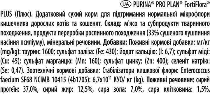 Purina Pro Plan FortiFlora Plus (Плюс)- додатковий корм для дорослих котів та кошенят (після відлучення від матері) із синбіотичною дією пребіотика та пробіотика. Сприяє підтриманню здорового мікробіому, його балансу та зміцненню імунного захисту. Кожне саше містить гарантований рівень пробіотичних бактерій (мікрокапсульованих для підвищення стабільності в середовищі та ефективності) в поєднанні з пребіотиком рослинного походження.Переваги:Синбіотична дія пробіотика та пребіотика для підтримки здорового мікробіома кишківникаМістить той самий пробіотичний штам, що і Purina Pro Plan FortiFlora (живі молочнокислі бактерії SF68) для підтримання здоровя кишківника та сприяння зміцненню імунної системиКрім того, він містить пребіотичні волокна рослинного походження (псилліум) для стимуляції росту корисних бактерій у кишківникаЧудовий смак: можна легко висипати вміст саше на корм кота, тварина їстиме його із задоволеннямСклад:мясо та субпродукти тваринного походження, продукти перероблення рослинного походження (33 сушеного лушпиння насіння псиліуму), мінеральні речовини.Поживні кормові добавки:мгкг (mgkg): таурин: 1600 сульфат заліза: (Fe: 430) йодат кальцію: (I: 6.7) сульфат міді: (Cu: 45) сульфат марганцю: (Mn: 160) сульфат цинку: (Zn: 400) селеніт натрію (Se: 0.47).Зоотехнічні кормові добавки:Стабілізатори кишкової флори:Enterococcus faecium SF68 NCIMB 10415 (4b1705): 6.7 x 1011 КУОкг (kg).Поживні речовини:сирий протеїн: 37.0 сирий жир: 12.5 сира зола: 7.0 сира клітковина: 1.5.Рекомендації щодо годівлі:висипте вміст одного саше на звичайний корм Вашого кота один раз на день.Рекомендації щодо зберігання:Зберігати за температури 2 - 25C. Дату Вжити до кінця, реєстраційний номер фабрики та номер партії - див. на зворотному боці упаковки.