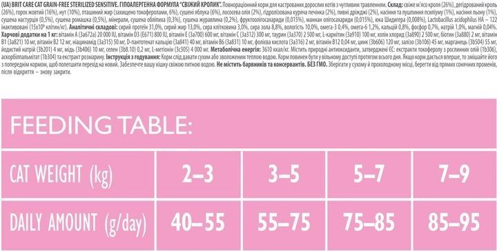 Сухий корм для стерилізованих котів Brit Care Cat Grain-Free Sterilized SensitiveГіпоалергенна рецептура зі свіжим кроликовим мясом для дорослих стерилізованих котів з чутливим травленням.Чому варто купити сухий корм для стерилізованих котів Brit Care Cat Grain-Free Sterilized Sensitive: Обліпиха сприяє здоровю нирок та сечовивідних шляхів. Пробіотики та пребіотики допомагають підтримувати здорове травлення та імунітет. Низький вміст магнію та l-метіоніну забезпечує оптимальний рівень pH сечі 6,0-6,5.Корм Brit Care Cat Grain-Free Sterilized Sensitive: Здоровя сечовивідних шляхів: обліпиха та настурція сприяють здоровю нирок та сечовивідних шляхів. Низький вміст магнію та L-метіоніну допомагає підтримувати оптимальний рівень pH сечі на рівні 6,0-6,5. Натуральні антиоксиданти: багаті натуральні антиоксиданти та вітамін Е, фрукти та трави захищають від вільних радикалів та підтримують сильну імунну систему протягом усього життя вашого котика. Вони також забезпечують збереження органолептичних та поживних властивостей продукту протягом терміну його зберігання. Здоровя шлунково-кишкового тракту: свіжий кролик - дієтичне мясо з відмінною засвоюваністю. Воно має високий рівень ненасичених жирних кислот та низький рівень холестерину, що сприяє здоровю серця та системи кровообігу та допомагає підтримувати оптимальну фізичну форму. Відмінний смак та спокусливий аромат: поєднання свіжого мяса та високоякісного мясного борошна робить смак та аромат Brit Care Cat привабливим навіть для найвибагливіших котів. Беззернова рецептура на основі свіжого мяса, яка легко засвоюється, багата на необхідні поживні речовини, для максимально повного та легкого поглинання поживних речовин.