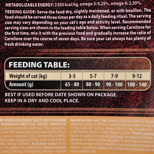 Carnilove Cat DuckTurkey Large повнораціонний збалансований беззерновий сухий корм класу холістик для дорослих кішок великих порід.Склад: борошно з мяса качки (32), борошно з мяса індички (18), жовтий горох (16), курячий жир (консервований токоферол, 11), качка без кісток (5), куряча печінка (3), лососева олія (1), тапіоковий крохмаль (3), яблука (6), морква (1), насіння льону (1), нут (1), оливкова олія (0,8), екстракт зелених губчастих молюсків (Perna canaliculus, 0,1), екстракт зеленого чаю (0,1), гідролізовані мушлі ракоподібних (джерело глюкозаміну, 0,026), хрящовий екстракт (джерело хондроїтину, 0,016), пивні дріжджі (джерело мананоолігосахаридів, 0,016), корінь цикорію (джерело фруктоолігосахаридів, 0,012), екстракт юки Шидигера (0,01), водорості (0,01), подорожник (0,01), чебрець (0,01), розмарин (0,01), орегано (0,01), журавлина (0,0008), чорниця (0,0008), малина (0,0008).Енергетична цінність: 3950 ккалкг. Омега-3: 0.25, Омега-6: 2.5.Рекомендації щодо годування:давати корм сухим або змочивши у теплій воді або бульйоні. Годувати кота необхідно тричі на день. Кількість корму може бути змінена залежно від віку та активності вашого кота. Коли годуєте кормом Carnilove вперше, змішуйте невелику кількість із попереднім кормом, і збільшуйте співвідношення поступово упродовж тижня. Завжди перевіряйте наявність свіжої води.