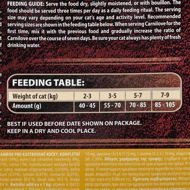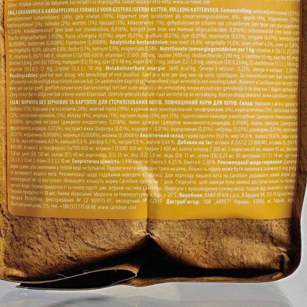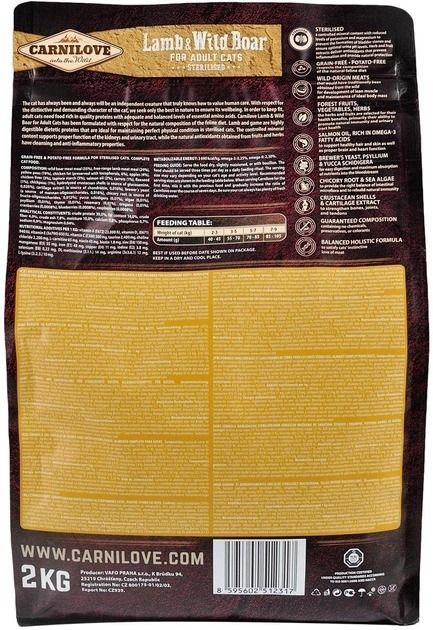 Carnilove LambWild Boar Sterilised повнораціонний збалансований без зерновий сухий корм класу холістик для кастрованих котів і стерилізованих кішок.Склад: борошно з мяса дикого кабана (35), борошно з мяса ягняти (24), жовтий горох (19), курячий жир (консервований токоферол, 6), куряча печінка (3), лососева олія (2), тапіоковий крохмаль (3), яблука (4), морква (1), насіння льону (1), нут (1), гідролізовані мушлі ракоподібних (джерело глюкозаміну, 0,026), хрящовий екстракт (джерело хондроїтину, 0,016), пивні дріжджі (джерело мананоолігосахаридів, 0,016), корінь цикорію (джерело фруктоолігосахаридів, 0.012), екстракт юки Шидигера (0,01), водорості (0,01), подорожник (0,01), чебрець (0,01), розмарин (0,01), орегано (0,01), журавлина (0,0008), чорниця (0,0008), малина (0,0008).Енергетична цінність: 3690 ккалкг. Омега-3: 0,25, Омега-6: 2.3.Рекомендації щодо годування:давати корм сухим або змочивши у теплій воді або бульйоні. Годувати кота необхідно тричі на день. Кількість корму може бути змінена залежно від віку та активності вашого кота. Коли годуєте кормом Carnilove вперше, змішуйте невелику кількість із попереднім кормом, і збільшуйте співвідношення поступово упродовж тижня. Завжди перевіряйте наявність свіжої води.