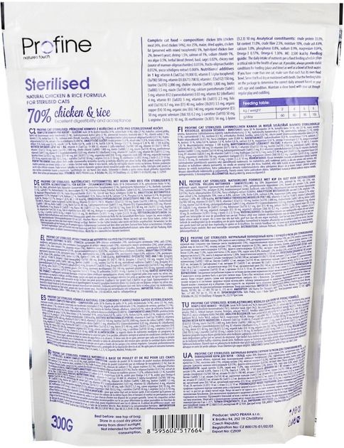 Суперпреміальна лініяProfineрозроблена згідно з останніми науковими дослідженнями котячого харчування. Основна мета Profine надання здорового, що забезпечує гарну фізичну форму, харчування, і задовольняє різні поживні потреби кішок і котів. Наші формули на основі курячого мяса або лосося враховують природні потреби котячого організму, але водночас також містять функціональні інгредієнти, які дають додаткову користь здоровю кішок і котів. Котячий корм Profine не містить компонентів, які можуть викликати побічні ефекти, такі як: харчова алергія, харчова нестерпність, травні або кишкові розлади.Склад:курка 38 (борошно з мяса курки 24, висушене мясо курки 14), рис (25), кукурудза, сушені яблука, курячий жир (збережений за допомогою суміші токоферолів) (5), гідролізована куряча печінка (2), пивні дріжджі, рибячий жир із лосося (1), хлорид натрію (1), морські водорості (0.5), травяна суміш (фенхель, базилік, шавлія 0.02), корінь цикорію (джерело манан-олігосахаридів 0.015), фруктів-олігосахариди (0.012), екстракт юки (Yucca schidigera), (0.008)Аналітичний склад:сирий білок 33, сирий жир 11, сира клітковина 2.5, волога 1, сира зола 8.8, кальцій 1, фосфор 0.8, натрій 0.9, магній 0.04, омега-3 0.17, омега-6 1.3Енергетична цінність:3500 ккалкг