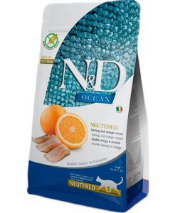 Сухий корм для котів Farmina ND Grain Free Ocean Sterilized з оселедцем та апельсином- збалансоване харчування для дорослих стерилізованих кішок і кастрованих котів з оселедцем і апельсином без вмісту злаків.Риба є дуже цінним джерелом білка і багатьох мікроелементів і мінералів. Мясо риби володіє також відмінним смаком і запахом, що не зможе залишити байдужою жодну кішечку. Крім смаку і запаху цей корм містить ряд мінералів, які допомагають зміцнити кісткову структуру скелета, підтримати суглоби і звязки тварини, а завдяки вітамінам, які міститися в апельсині та інших овочах, ефективно зміцнюється імунітет, а клітини отримують антиоксидантний захист.Рекомендації щодо застосування:Рекомендована добова кількість корму вказана в таблиці на упаковці.При переведенні на ND рекомендується поступово заміщати попередній корм на новий.Завжди залишайте миску свіжої питної води протягом дня.Зберігати в прохолодному, сухому місці, в закритій упаковці.Вироблено за 18 місяців до закінчення терміну придатності, зазначеного на упаковці.Склад товару:Склад:свіжий оселедець (34), дегідратований оселедець (32), солодка картопля, зневоднені яйця, рибячий жир (оселедця), пульпа цукрових буряків, сушена морква, сушена люцерна, інулін, фруктоолігосахариди, дріжджовий екстракт (джерело манноолігосахаридів), дегідратований солодкий апельсин (0,5), сушені яблука, сушений гранат, сушений шпинат, подорожник, сушена чорниця, хлорид натрію, сухі пивні дріжджі, корінь куркуми (0,2), екстракт алое вера.Харчові добавки на 1 кг:Вітамін А - 18000МЕ Вітамін D3 - 1200МЕ Вітамін Е - 600мг Вітамін С - 300мг Ніацин - 150мг D-кальцію пантотенат - 50мг Вітамін В2 - 20мг Вітамін В6 - 8,1 мг Вітамін В1 - 10 мг Біотин - 1,5 мг Фолієва кислота - 1,5 мг Вітамін В12 - 0,1 мг Холіну хлорид - 2800 мг Бета-каротин - 1,5 мг Цинк (Хелат цинку гідрокси-аналога метіоніну) - 163,8 мг Марганець (Хелат марганцю гідрокси-аналога метіоніну) - 64,6 мг Залізо (Хелат заліза гідрату гліцину) - 58,3 мг Мідь (Хелат міді гідрокси-аналога метіоніну) - 15,8 мг DL-метіонін, технічно чистий - 5000мг Таурин - 5000мг L-карнітин - 400мг.Спеціальні добавки:екстракт зеленого чаю - 100 мг екстракт розмарину.Антиоксиданти:екстракт токоферолів натурального походження.Поживні речовини:сирий протеїн - 46,00 сирий жир і олії - 11,00 сира клітковина - 5,10 волога - 8,00 сира зола - 8,90 кальцій - 1,00 фосфор - 0,90 магній - 0,08 Омега-6 - 1,80 Омега-3 - 0,60 докозагексаєнова кислота (DHA) - 0,35 ейкозапентаєнова кислота (EPA) - 0,15.Енергетична цінність:ЕМ Ккалкг 3643 - МДжкг 15,24.