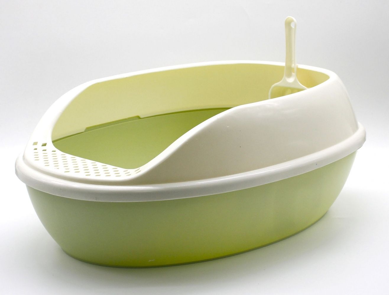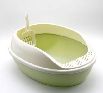 Туалет для кішок пластиковий, розмір 534020см Матовий, овальної форми з бортиком, на якому є отвори, колір оливковий, з лопаткою.