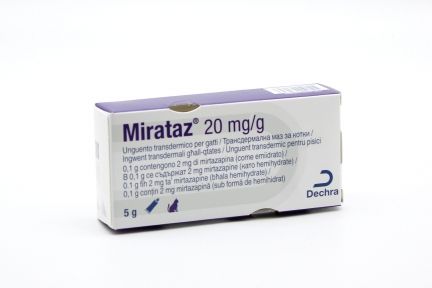 Mirataz (Міртазапінова трансдермальна мазь) показаний для лікування та контролю втрати ваги у кішок.Хронічне захворювання нирок (ХЗН) є поширеним захворюванням у вікових кішок, причому на це захворювання страждають не менше 30 кішок у віці 15 років. В даний час ніяке лікування, крім трансплантації нирок, не може повернути назад або зупинити зниження функції нирок на значний період часу. Таким чином, медикаментозне лікування є основою лікування та може допомогти кішкам жити з метаболічними ускладненнями захворювання та покращити якість життя.Міртазапін, тетрациклічний антидепресант, корисний для ветеринарів через кілька корисних побічних ефектів, а саме, його значно виражене пригнічення нудоти, протиблювотних та стимулюючих апетит властивостей. Ці ефекти переважно опосередковані антагонізмом до 5-HT3-рецептору, що важливо у фізіології блювання.Фармакодинамічні та фармакокінетичні дослідження на кішках продемонстрували стимулюючі апетит властивості миртазапіну, а також визначили відповідні дози та інтервали для здорових кішок та кішок з ХЗН. Метою цього клінічного дослідження було оцінити ефективність міртазапіну як стимулятор апетиту та протиблювотного засобу у кішок, тим самим надавши докази цінності цього препарату в управлінні харчуванням кішок із ХЗН.