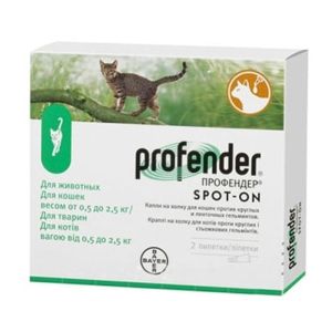 Склад і форма випускуПрофендер комплексний лікарський антигельмінтний засіб. Профендер в якості діючих речовин містить емодепсид і празиквантел, а також допоміжні компоненти (бутилгидро-оксианизол, изопропилиден гліцерол, молочну кислоту). Препарат являє собою прозорий розчин для зовнішнього застосування від жовтого до коричневого кольору, в 1 мл якого міститься 21,4 мг емодепсида і 85,8 мг празиквантелу. Випускають препарат розфасованим по 0,35 мл у поліпропіленових піпетках з ковпачками, упакованих по 2 штуки в алюмінієві блістери, поміщені у картонні коробки. Фармакологічні властивості Профендер володіє широким спектром антигельмінтного дії на круглих і стрічкових гельмінтів, в т. ч. Тохосага саti, Toxascaris leoninа, Ancylostoma tubaeforme, Echinococcus multilocularis, Dipylidium caninum, Taenia taeniaeformis, що паразитують у собак. Эмодепсид, що входить до складу препарату, є напівсинтетичним зєднанням з групи депсипептидов і має нематодоцідним дією. Надаючи стимулюючу дію на пресинаптичні латрофилиновие рецептори, емодепсид викликає параліч і загибель паразита. Механізм дії празиквантелу полягає в деполяризації нейромязових гангліоблокаторів, порушення транспорту глюкози і микротурбулярной функції всіх фаз розвитку цестод, викликаючи порушення нервово-мязової іннервації, параліч і загибель паразитів. Фармакокінетичні властивості препарату забезпечують його гарне всмоктування з місця нанесення і тривале збереження в терапевтичної концентрації в організмі тварини. Максимальні концентрації празиквантелу і емодепсида відзначаються в сироватці крові через 2 4 доби виводяться зєднання з організму в основному з сечею у незміненому вигляді та частково в метаболизированной формі протягом 28 30 діб. Профендер за ступенем впливу на організм відноситься до помірно небезпечних речовин, у рекомендованих дозах не чинить місцевоподразнювальної, ембріотоксичної, тератогенної, мутагенної та імунотоксичної дії. Препарат добре переноситься кішок різних порід в терапевтичній і в 3-кратній терапевтичній дозі.Дози і спосіб застосування Перед використанням з піпетки знімають захисний ковпачок і, розташувавши її вертикально, проколюють захисну мембрану носика піпетки (надівши ковпачок із зворотного боку), потім знову знімають ковпачок. Препарат, розсунувши шерсть, наносять в місця, недоступні для злизування, безпосередньо на шкіру між лопатками біля основи шиї. Мінімальна терапевтична доза профендера становить 0,14 млкг маси тварини. Дегельмінтизацію кішок з використанням профендера проводять, починаючи з 8-тижневого віку, з лікувальною метою за показаннями, з профілактичною щоквартально. Побічні дії Побічних явищ і ускладнень у кішок чистих і помісних порід, в т. ч. вагітних і лактуючих, при застосуванні препарату згідно з інструкцією, як правило, не спостерігається. У поодиноких випадках після застосування препарату можливі індивідуальні реакції (почервоніння шкіри, свербіж, посилена салівація), які самостійно проходять і не вимагають застосування лікарських засобів. Протипоказання Профендер не слід застосовувати кошенятам молодше 8-тижневого віку. Особливі вказівкиПід час процедури з профендером слід дотримувати загальноприйняті правила особистої гігієни і техніки безпеки, передбачені при роботі з лікарськими засобами для тварин. По закінченні процедури слід р