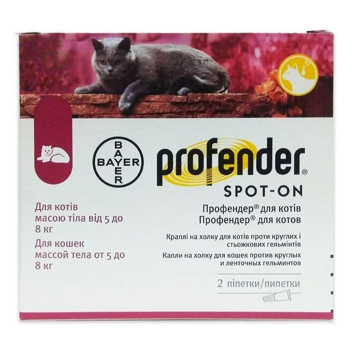 Склад і форма випускуПрофендер комплексний лікарський антигельмінтний засіб. Профендер в якості діючих речовин містить емодепсид і празиквантел, а також допоміжні компоненти (бутилгидро-оксианизол, изопропилиден гліцерол, молочну кислоту). Препарат являє собою прозорий розчин для зовнішнього застосування від жовтого до коричневого кольору, в 1 мл якого міститься 21,4 мг емодепсида і 85,8 мг празиквантелу. Випускають препарат розфасованим по 0,35 мл у поліпропіленових піпетках з ковпачками, упакованих по 2 штуки в алюмінієві блістери, поміщені у картонні коробки. Фармакологічні властивості Профендер володіє широким спектром антигельмінтного дії на круглих і стрічкових гельмінтів, в т. ч. Тохосага саti, Toxascaris leoninа, Ancylostoma tubaeforme, Echinococcus multilocularis, Dipylidium caninum, Taenia taeniaeformis, що паразитують у собак. Эмодепсид, що входить до складу препарату, є напівсинтетичним зєднанням з групи депсипептидов і має нематодоцідним дією. Надаючи стимулюючу дію на пресинаптичні латрофилиновие рецептори, емодепсид викликає параліч і загибель паразита. Механізм дії празиквантелу полягає в деполяризації нейромязових гангліоблокаторів, порушення транспорту глюкози і микротурбулярной функції всіх фаз розвитку цестод, викликаючи порушення нервово-мязової іннервації, параліч і загибель паразитів. Фармакокінетичні властивості препарату забезпечують його гарне всмоктування з місця нанесення і тривале збереження в терапевтичної концентрації в організмі тварини. Максимальні концентрації празиквантелу і емодепсида відзначаються в сироватці крові через 2 4 доби виводяться зєднання з організму в основному з сечею у незміненому вигляді та частково в метаболизированной формі протягом 28 30 діб. Профендер за ступенем впливу на організм відноситься до помірно небезпечних речовин, у рекомендованих дозах не чинить місцевоподразнювальної, ембріотоксичної, тератогенної, мутагенної та імунотоксичної дії. Препарат добре переноситься кішок різних порід в терапевтичній і в 3-кратній терапевтичній дозі.Дози і спосіб застосування Перед використанням з піпетки знімають захисний ковпачок і, розташувавши її вертикально, проколюють захисну мембрану носика піпетки (надівши ковпачок із зворотного боку), потім знову знімають ковпачок. Препарат, розсунувши шерсть, наносять в місця, недоступні для злизування, безпосередньо на шкіру між лопатками біля основи шиї. Мінімальна терапевтична доза профендера становить 0,14 млкг маси тварини. Дегельмінтизацію кішок з використанням профендера проводять, починаючи з 8-тижневого віку, з лікувальною метою за показаннями, з профілактичною щоквартально. Побічні дії Побічних явищ і ускладнень у кішок чистих і помісних порід, в т. ч. вагітних і лактуючих, при застосуванні препарату згідно з інструкцією, як правило, не спостерігається. У поодиноких випадках після застосування препарату можливі індивідуальні реакції (почервоніння шкіри, свербіж, посилена салівація), які самостійно проходять і не вимагають застосування лікарських засобів. Протипоказання Профендер не слід застосовувати кошенятам молодше 8-тижневого віку. Особливі вказівкиПід час процедури з профендером слід дотримувати загальноприйняті правила особистої гігієни і техніки безпеки, передбачені при роботі з лікарськими засобами для тварин. По закінченні процедури слід р