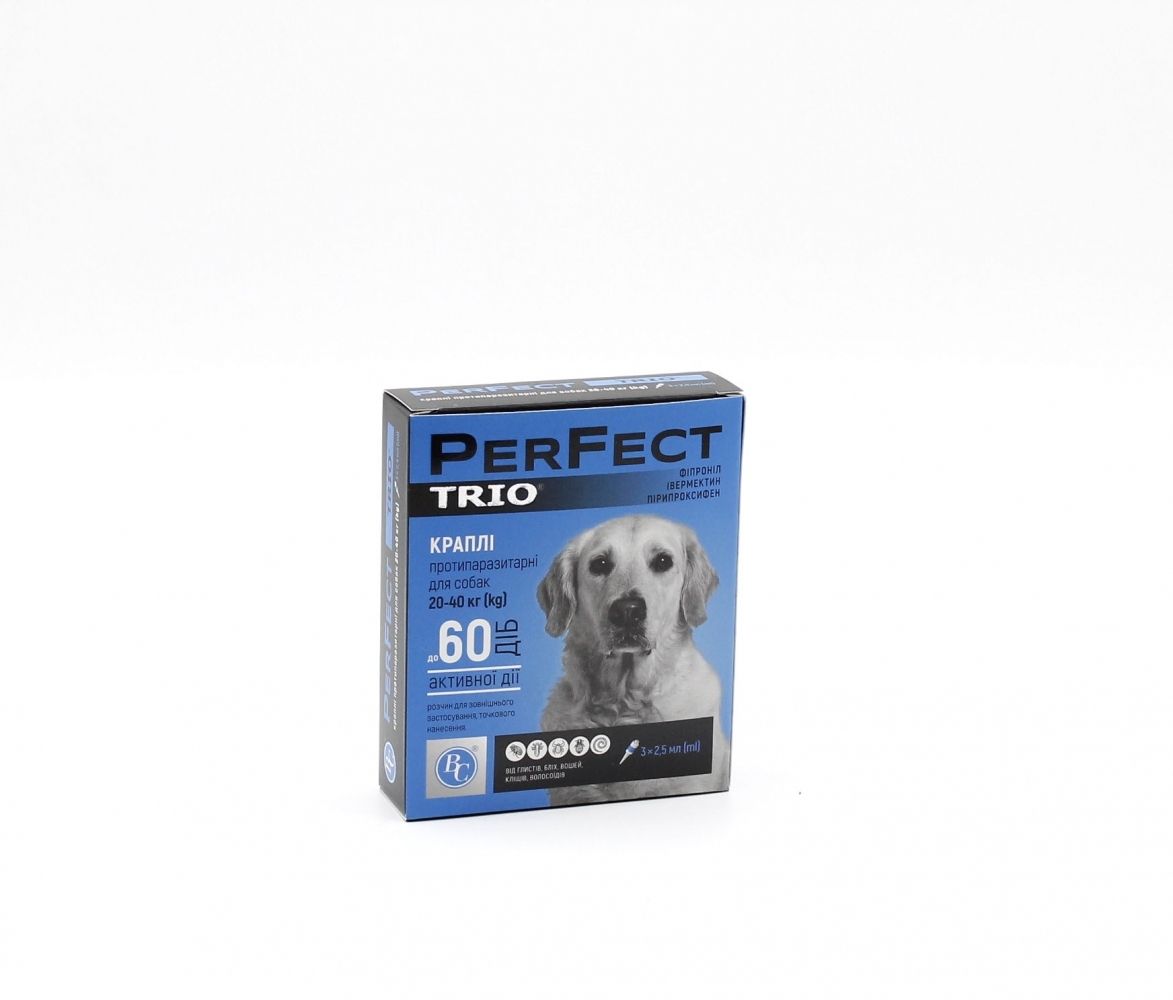 Краплі Ветсинтез Perfect Trio для собак 2040 кг проти бліх, кліщів та комарів, 3 піпетки по 2,5 мл