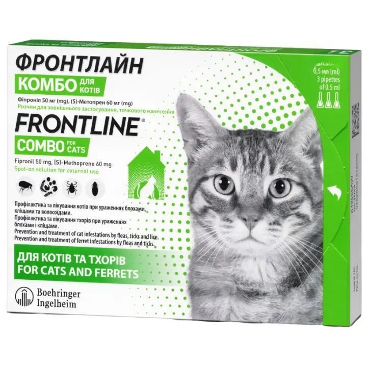Frontline ComboКраплі від бліх та кліщів для котівМає виражену контактну інсектоакарицидну діюЗахищає від вошей, бліх, власоїдів та кліщів (іксодові, хейлітелі)Діє на стадії яйця та личинки бліхЧинить інсектоакарицидну дію в місцях локалізації ектопаразитів.Швидкий ефектЗахисна дія препарату проти іксодових кліщів триває не менше 1 місяця, проти інших до 3 місяців.Можна застосовувати вагітним кішкамДозування та спосіб застосуванняОдин тюбик призначений для обробки однієї кішкиПорядок застосування: Лише для зовнішнього використання.Розділіть шерсть на загривку або між лопатками так, щоб було видно шкіру.Розмістивши вузький кінець піпетки на шкіру, необхідно стиснути піпетку кілька разів, щоб весь її вміст випливло на шкіру.Зручніше обробляти, завдаючи препарат у 3-4 крапки вздовж хребта від холки до кореня хвоста.Не рекомендується купати тварину за 3 дні до та 3 дні після обробки.Речовини, що діють:фіпроніл-9,8 іS-метопрен-8,8Виробник:Меріал, Франція