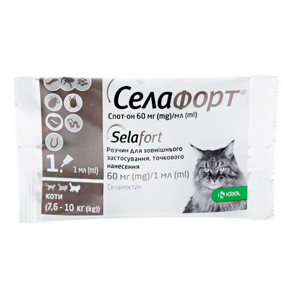 Селафорт відноситься до протипаразитарний лікарських препаратів групи макроциклічних лактонів.Діюча речовина препарату - селамектин володіє широким спектром системного нематодоцидного, інсектицидної і акарицидної дії, активний проти нематод, комах і саркоптоидних кліщів, що паразитують у собак і кішок, володіючи ларвицидними і овоцидними властивостями, перериває цикл розвитку комах. Фармакокінетичні властивості препарату забезпечують хороше всмоктування селамектина з місця нанесення, тривале підтримання терапевтичних концентрацій в органах і тканинах тварини, що забезпечує знищення паразитів і захист тварин від реінвазії протягом місяця. Механізм дії селамектина полягає в його здатності звязуватися з рецепторами клітин (мязової і нервової тканини) паразитів, підвищувати проникність мембран для іонів хлору, що викликає блокаду провідності нервових і мязових клітин у нематод, комах, кліщів і призводить до паралічу і загибелі паразитів. Враховуючи, що у ссавців рецептори, чутливі до селамектину, локалізовані тільки в центральній нервовій системі, а селамектин не проникає через гематоенцефалічний барєр, отруєння собак і кішок малоймовірно.Селафорт за ступенем впливу на організм відноситься до помірно небезпечних речовин (3 клас небезпеки по ГОСТ 12.1.007-76), у рекомендованих дозах не виявляє місцево-подразнювальну, резорбтивно-токсичним і сенсибілізірующим дією, добре переноситься кішками і собаками різних порід, включаючи коллі та споріднені породи собак. Препарат токсичний для бджіл, а також для риб та інших гідробіонтів.ПОКАЗАНИЯСелафорт призначають собакам і кішкам з лікувальною і профілактичною метою при ентомозах, викликаних блохами, вошами і волосоїдів, отодектозе, саркоптоз, анкилостомозе і токсокарозе, а також для профілактики дирофіляріозу.ПРОТИВОПОКАЗАНИЯПротивопоказанием до застосування є підвищена індивідуальна чутливість тварини до компонентів препарату (у тому числі і в анамнезі). Селафорт не слід наносити на вологе або пошкоджену шкіру.Вагітним і лактуючим самкам при необхідності Селафорт застосовують після консультації з ветеринарним лікарем. Селафорт не слід застосовувати цуценят і кошенят віком до 6-тижневого віку.СоставСелафорт у формі 6 і 12 розчину в якості діючої речовини містить селамектин відповідно 60 мг мл і 120 мг мл допоміжні речовини: ізопропіловий спирт, бутилгидрокситолуол, диметилсульфоксид.За зовнішнім виглядом препарат являє собою прозорий розчин від безбарвного до жовтого кольору, або від безбарвного до коричневого, або від безбарвного до коричнево-жовтого, або від безбарвного до жовто-зеленого кольору.Селафорт випускають розфасованим в полімерні піпетки різного обєму з ковпачками різного кольору - Селафорт 6 розчин по: 0,25 мл (рожевий ковпачок), 0,75 мл (бірюзовий ковпачок), 1 мл (сіро-коричневий ковпачок) Селафорт 12 розчин по: 0,25 мл (фіолетовий ковпачок), 0,5 мл (помаранчевий ковпачок), 1 мл (червоний ковпачок), 2 мл (зелений ковпачок), 3,0 мл (темно-синій ковпачок).Піпетки упаковують по 1 штуці на блістер, який поміщають разом з інструкцією по застосуванню в картонні коробки. Колір коробки і ковпачків піпеток в цій коробці однакові.Відпускається без рецепта ветеринарного лікаря.РекомендацииСелафорт застосовують собакам і кішкам шляхом одноразового нанесення на суху, неушкодже