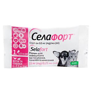 Селафорт відноситься до протипаразитарний лікарських препаратів групи макроциклічних лактонів.Діюча речовина препарату - селамектин володіє широким спектром системного нематодоцидного, інсектицидної і акарицидної дії, активний проти нематод, комах і саркоптоидних кліщів, що паразитують у собак і кішок, володіючи ларвицидними і овоцидними властивостями, перериває цикл розвитку комах. Фармакокінетичні властивості препарату забезпечують хороше всмоктування селамектина з місця нанесення, тривале підтримання терапевтичних концентрацій в органах і тканинах тварини, що забезпечує знищення паразитів і захист тварин від реінвазії протягом місяця. Механізм дії селамектина полягає в його здатності звязуватися з рецепторами клітин (мязової і нервової тканини) паразитів, підвищувати проникність мембран для іонів хлору, що викликає блокаду провідності нервових і мязових клітин у нематод, комах, кліщів і призводить до паралічу і загибелі паразитів. Враховуючи, що у ссавців рецептори, чутливі до селамектину, локалізовані тільки в центральній нервовій системі, а селамектин не проникає через гематоенцефалічний барєр, отруєння собак і кішок малоймовірно.Селафорт за ступенем впливу на організм відноситься до помірно небезпечних речовин (3 клас небезпеки по ГОСТ 12.1.007-76), у рекомендованих дозах не виявляє місцево-подразнювальну, резорбтивно-токсичним і сенсибілізірующим дією, добре переноситься кішками і собаками різних порід, включаючи коллі та споріднені породи собак. Препарат токсичний для бджіл, а також для риб та інших гідробіонтів.ПОКАЗАНИЯСелафорт призначають собакам і кішкам з лікувальною і профілактичною метою при ентомозах, викликаних блохами, вошами і волосоїдів, отодектозе, саркоптоз, анкилостомозе і токсокарозе, а також для профілактики дирофіляріозу.ПРОТИВОПОКАЗАНИЯПротивопоказанием до застосування є підвищена індивідуальна чутливість тварини до компонентів препарату (у тому числі і в анамнезі). Селафорт не слід наносити на вологе або пошкоджену шкіру.Вагітним і лактуючим самкам при необхідності Селафорт застосовують після консультації з ветеринарним лікарем. Селафорт не слід застосовувати цуценят і кошенят віком до 6-тижневого віку.СоставСелафорт у формі 6 і 12 розчину в якості діючої речовини містить селамектин відповідно 60 мг мл і 120 мг мл допоміжні речовини: ізопропіловий спирт, бутилгидрокситолуол, диметилсульфоксид.За зовнішнім виглядом препарат являє собою прозорий розчин від безбарвного до жовтого кольору, або від безбарвного до коричневого, або від безбарвного до коричнево-жовтого, або від безбарвного до жовто-зеленого кольору.Селафорт випускають розфасованим в полімерні піпетки різного обєму з ковпачками різного кольору - Селафорт 6 розчин по: 0,25 мл (рожевий ковпачок), 0,75 мл (бірюзовий ковпачок), 1 мл (сіро-коричневий ковпачок) Селафорт 12 розчин по: 0,25 мл (фіолетовий ковпачок), 0,5 мл (помаранчевий ковпачок), 1 мл (червоний ковпачок), 2 мл (зелений ковпачок), 3,0 мл (темно-синій ковпачок).Піпетки упаковують по 1 штуці на блістер, який поміщають разом з інструкцією по застосуванню в картонні коробки. Колір коробки і ковпачків піпеток в цій коробці однакові.Відпускається без рецепта ветеринарного лікаря.РекомендацииСелафорт застосовують собакам і кішкам шляхом одноразового нанесення на суху, неушкодже