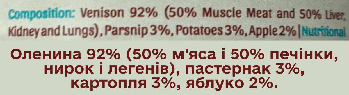 - Натуральність: 100% натуральна оленина, без зерна, мінімальна кількість інгредієнтів.