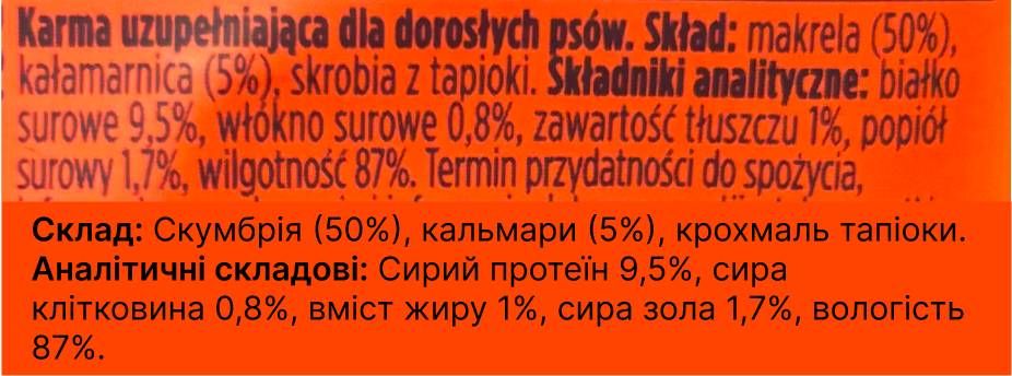 Поєднання скумбрії та кальмара не тільки дарує чудовий смак, але й забезпечує собаку корисними Омега-3 жирними кислотами, які сприяють здоров’ю шкіри, блиску шерсті та підтримці суглобів.