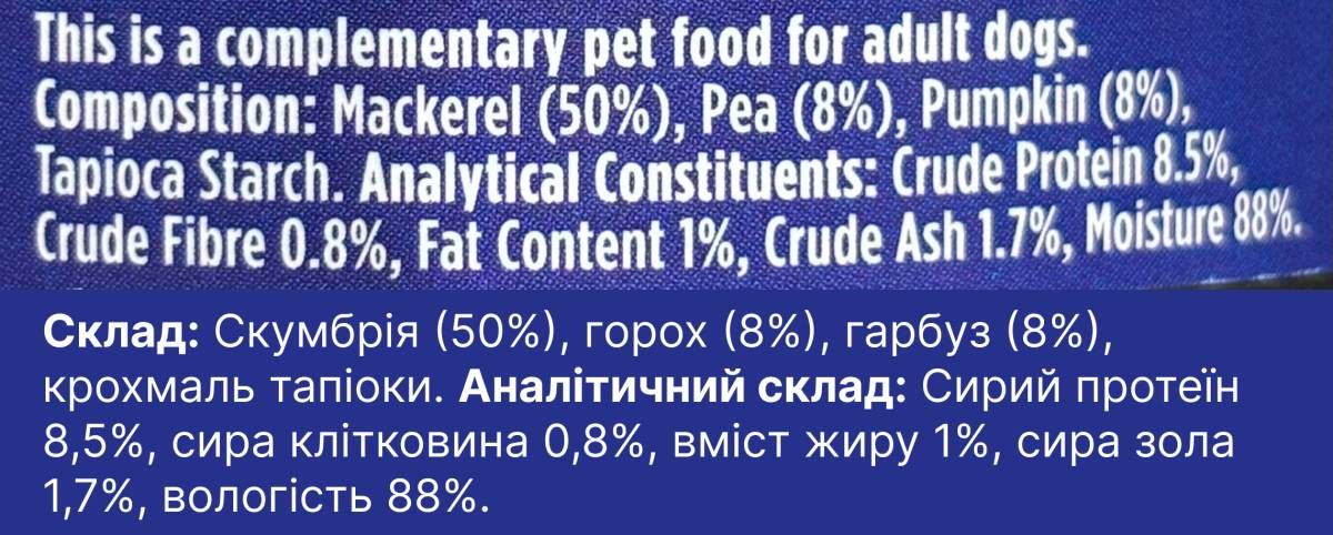 - Натуральні інгредієнти – скумбрія, горох і гарбуз без штучних добавок
