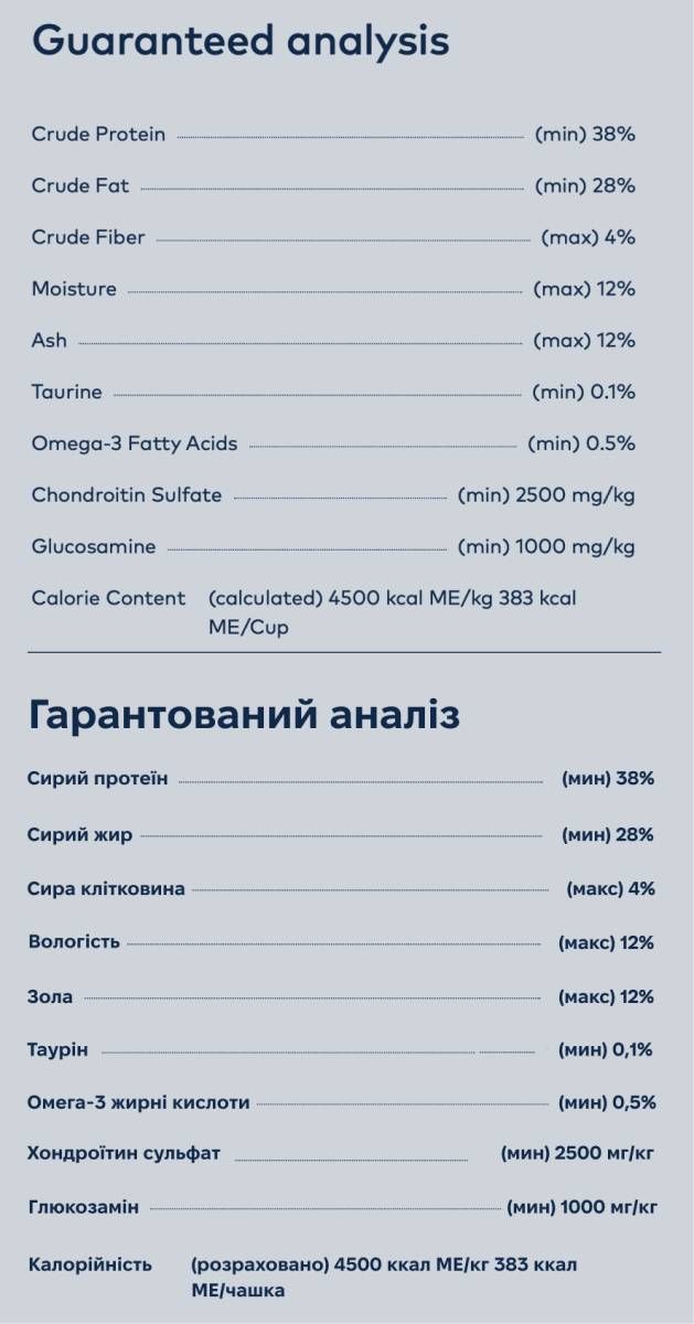 - Таурин: Ключова амінокислота для котів, яка підтримує зір, серцево-судинну систему, імунітет і травлення. Оскільки коти не виробляють таурин самостійно, він має надходити виключно з корму — і найкращим джерелом є тваринні білки.