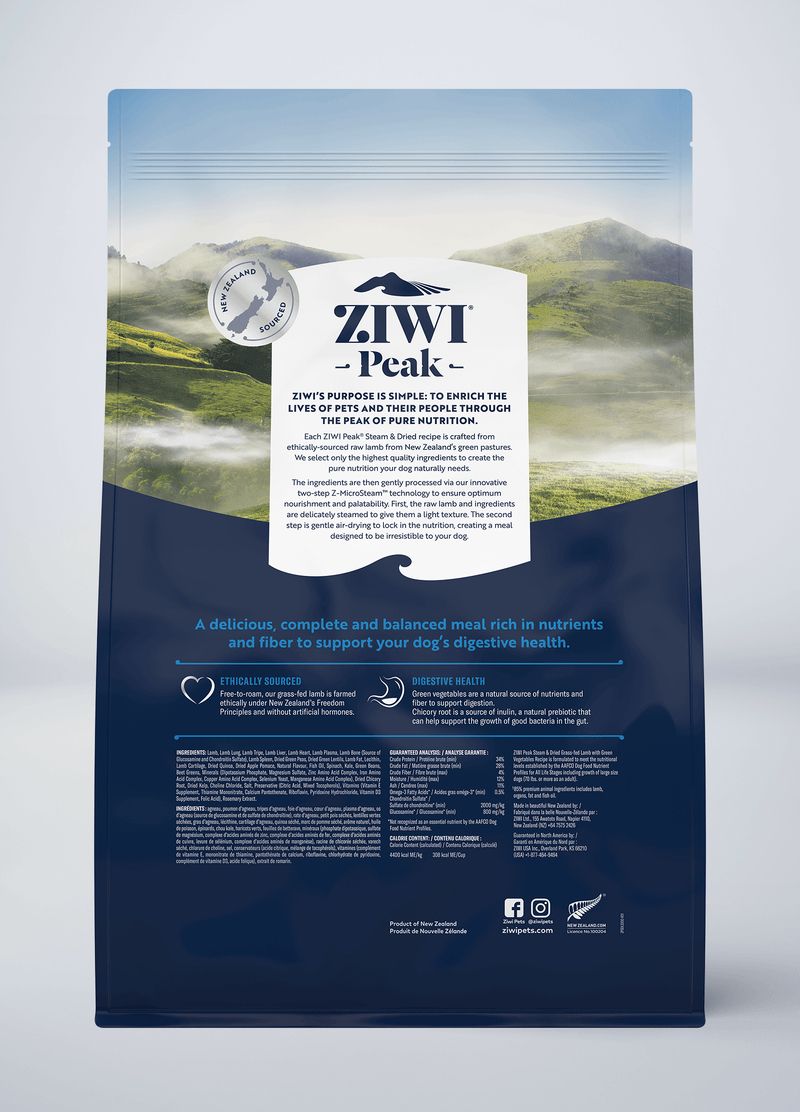 Насичений, збалансований та поживний — Ziwi Peak Lamb with Green Vegetables ідеально підходить для щоденного харчування вашого собаки. У рецепті — 85% м’яса й органів ягняти з екологічно чистих пасовищ Нової Зеландії, доповнених шпинатом, капустою кейл, зеленими бобами та коренем цикорію для підтримки травлення. ZIWI Peak Steam & Dried на 85-90% складається з сирого м'яса, органів і морепродуктів з додаванням фруктів і овочів і обробляється з використанням нашої технології Z-MicroSteam. Це забезпечує легку, приємну на смак текстуру і призначене для власників домашніх тварин, які хочуть забезпечити більш цілісний та інклюзивний раціон, включаючи фрукти та овочі поряд з сирим м'ясом і морепродуктами.