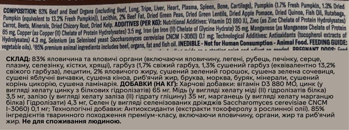 Ідеальний баланс природи та інновацій — це саме те, що пропонує рецептура Ziwi Peak Beef with Pumpkin. Створений на основі 85% преміального м’яса та органів яловичини, вирощеної на зелених пасовищах Нової Зеландії, цей корм містить також гарбуз та корінь цикорію — для підтримки здорового травлення. ZIWI Peak Steam & Dried на 85-90% складається з сирого м'яса, органів і морепродуктів з додаванням фруктів і овочів і обробляється з використанням нашої технології Z-MicroSteam. Це забезпечує легку, приємну на смак текстуру і призначене для власників домашніх тварин, які хочуть забезпечити більш цілісний та інклюзивний раціон, включаючи фрукти та овочі поряд з сирим м'ясом і морепродуктами.
