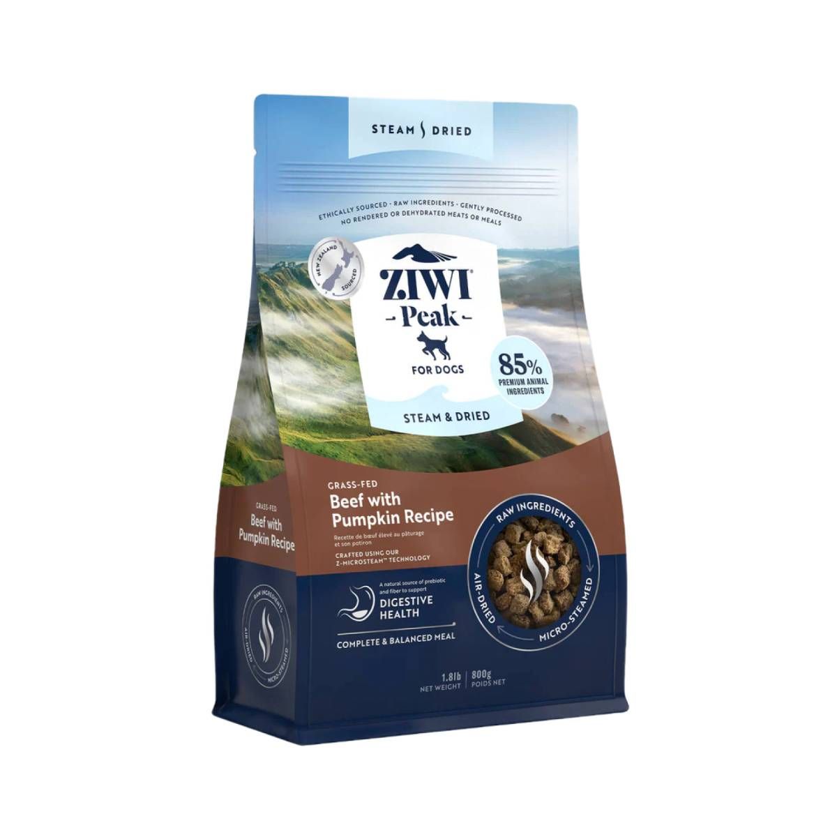 Ідеальний баланс природи та інновацій — це саме те, що пропонує рецептура Ziwi Peak Beef with Pumpkin. Створений на основі 85% преміального м’яса та органів яловичини, вирощеної на зелених пасовищах Нової Зеландії, цей корм містить також гарбуз та корінь цикорію — для підтримки здорового травлення. ZIWI Peak Steam & Dried на 85-90% складається з сирого м'яса, органів і морепродуктів з додаванням фруктів і овочів і обробляється з використанням нашої технології Z-MicroSteam. Це забезпечує легку, приємну на смак текстуру і призначене для власників домашніх тварин, які хочуть забезпечити більш цілісний та інклюзивний раціон, включаючи фрукти та овочі поряд з сирим м'ясом і морепродуктами.