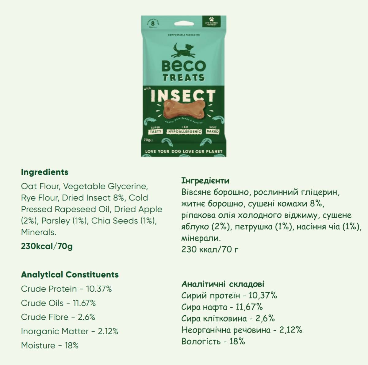 - Екологічна упаковка: Печиво упаковане в біорозкладну упаковку, що робить його не лише зручним для транспортування, але й екологічно чистим вибором для вас і вашого вихованця.