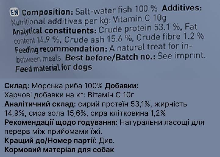 Завдяки 100% натуральному складу без зерна, глютену та штучних добавок, вони ідеально підходять для собак із чутливим травленням або алергією на інші види білка. А насичений аромат і смак риби зроблять їх улюбленим частуванням вашого улюбленця!