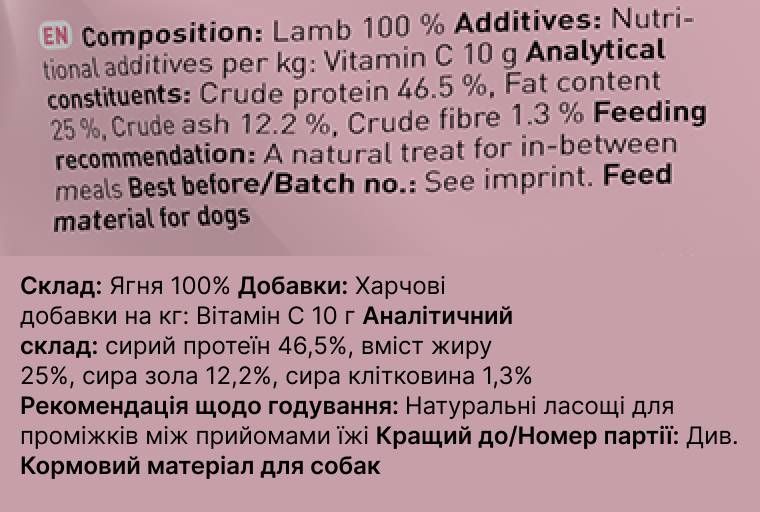 Ягня – це ніжне, дієтичне м’ясо з високим вмістом білка та цінних амінокислот, що сприяють здоров’ю м’язів і підтримці енергії. Завдяки натуральному висушуванню, ласощі зберігають максимум поживних речовин і мають чудовий аромат, який точно сподобається вашому хвостатому гурману.