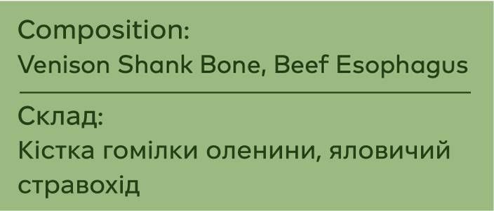 Цей довговічний та здоровий жувальний шматочок не тільки стане ласощами, які ваш собака полюбить, але й чудовим способом підтримати здоров’я його зубів природним шляхом. Ідеально підходить для всіх порід, погризуха з оленини надасть вашому собаці смачний і корисний досвід жування.