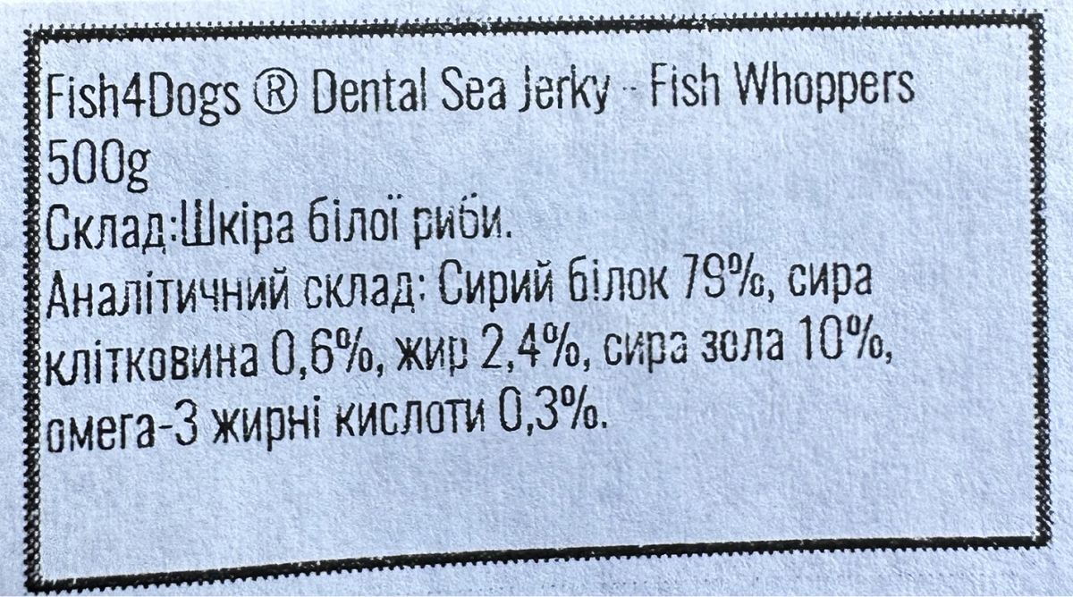 Ласощі для собак Fish Whoppers Sea Jerky — це товсті й великі шматки культового ласоща Sea Jerky, створені спеціально для великих порід або собак, які жують так, ніби це їхня робота на повний день. Якщо ваш пес вважає більшість смаколиків лише закускою, ці Whoppers зможуть його приємно «зайняти».