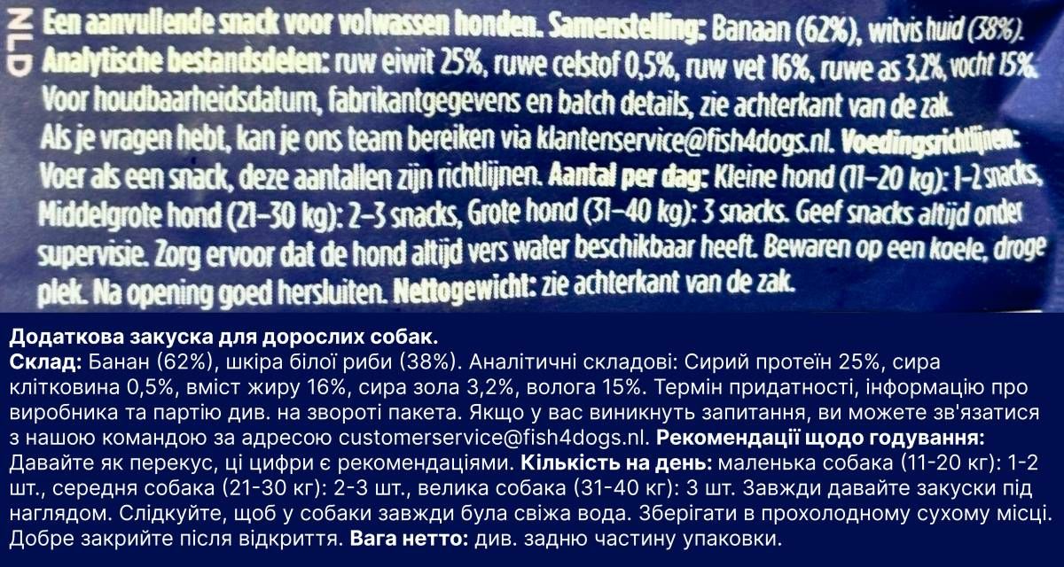- Натуральний склад – лише висушені банани та риб’яча шкірка без штучних добавок.