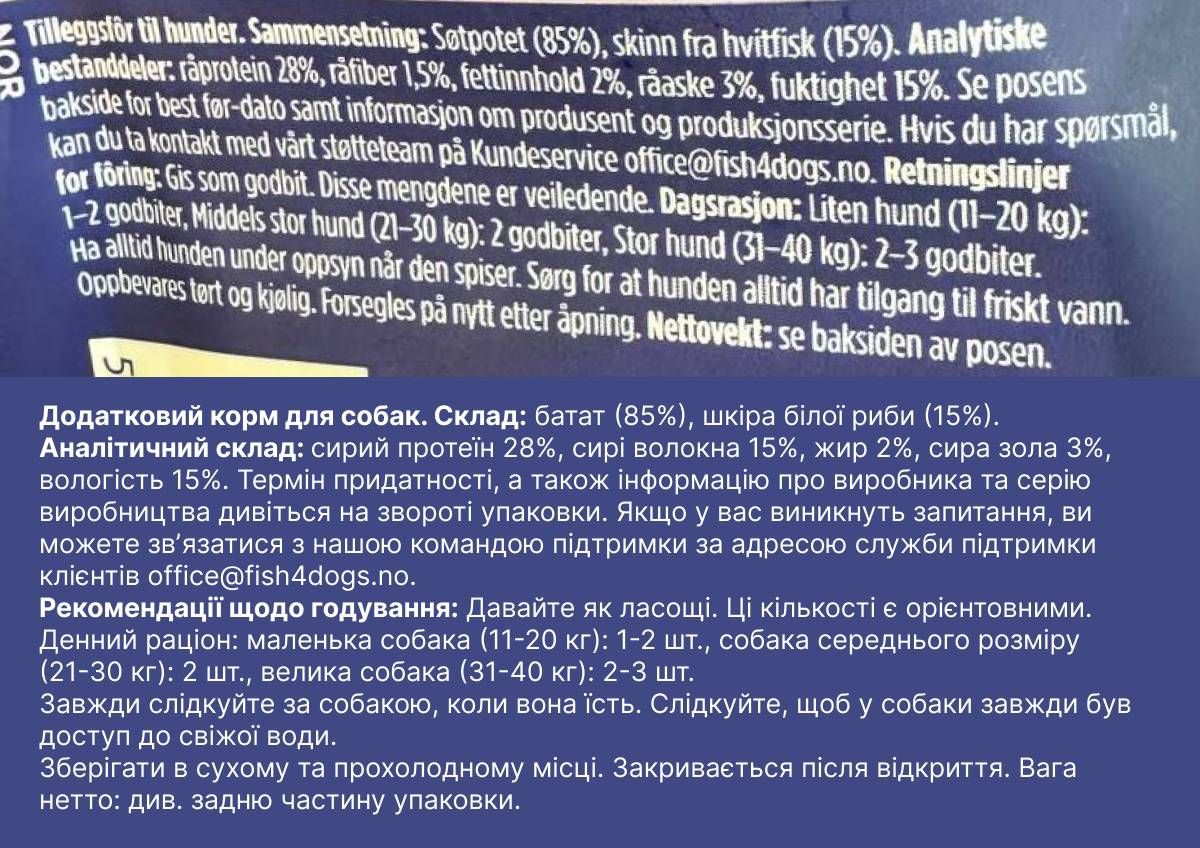 - Натуральний склад – лише батат і риб’яча шкірка без штучних добавок.