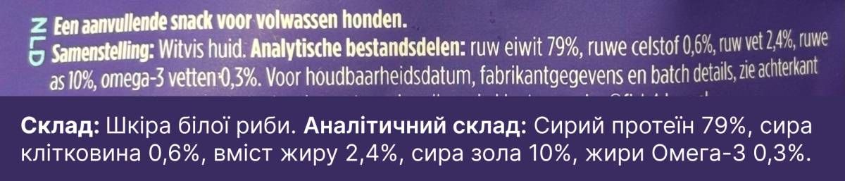 - 100% натуральний склад – лише висушена рибна шкіра, без штучних добавок.