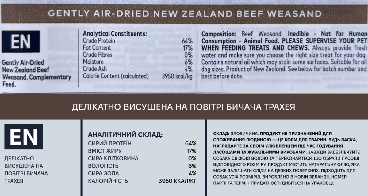 Мати-природа знає, що найкраще для здоров'я, тому ми слідуємо її порадам, коли мова йде про здорові ласощі для собак. Наше яловиче м'ясо, отримане від тварин, що пасуться на свіжій траві протягом усього року в Новій Зеландії, ретельно підготовлене за допомогою повільного та м'якого повітряного сушіння. Без додаткових інгредієнтів, тільки краще яловиче м'ясо, трахея є ідеальним способом порадувати вашого собаку.