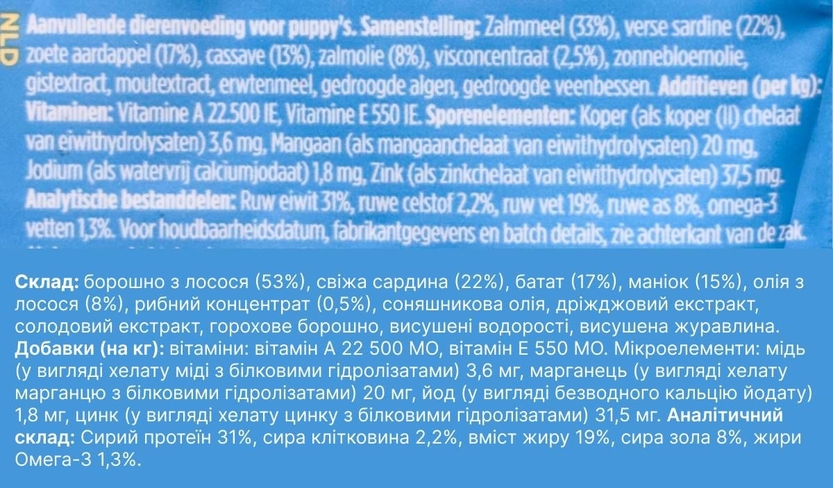 - Легкозасвоюваний білок – ідеальний для щенят, оскільки легко перетравлюється і сприяє правильному розвитку.