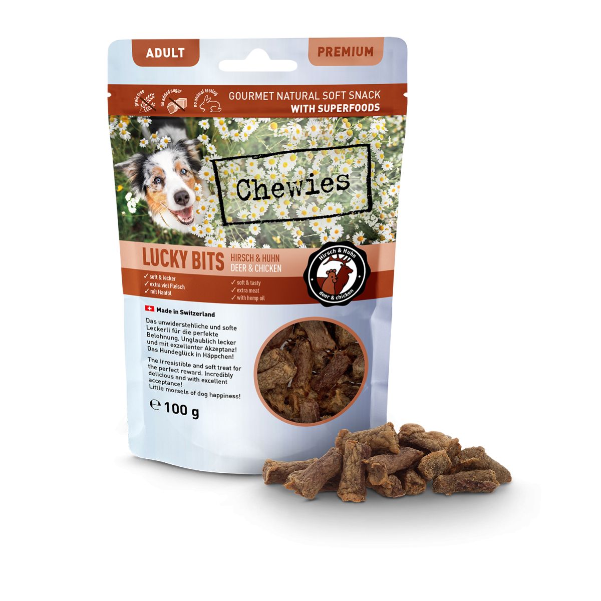 Chewies Lucky Bits з м'яса курки та оленини – це смачні та поживні ласощі, спеціально розроблені для дорослих собак. Поєднання м'яса курки та оленини забезпечує високоякісний білок, що підтримує здоров'я вашого улюбленця на кожному етапі життя. Ласощі не містять штучних добавок і чудово підходять для собак з чутливим травленням.