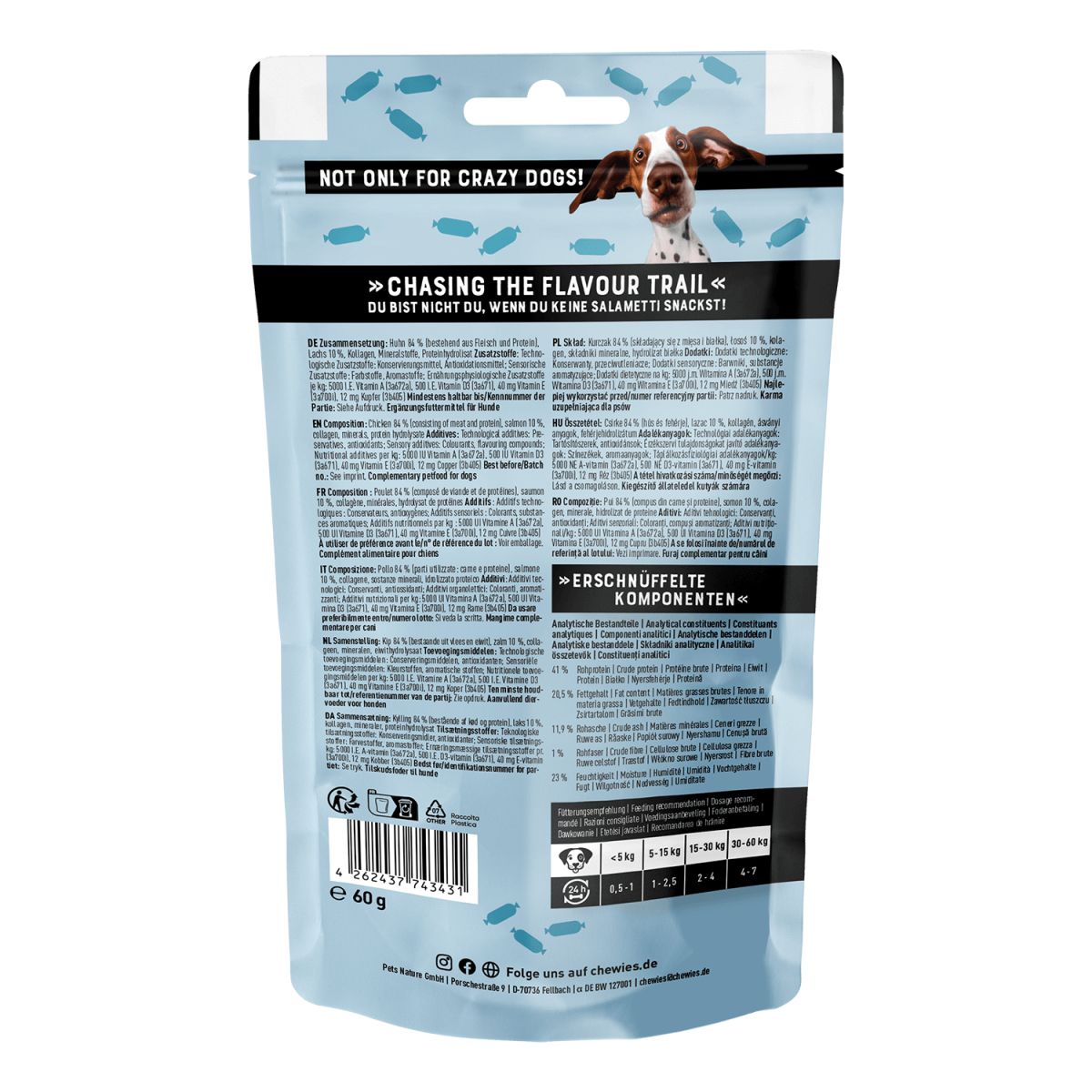 Chewies Salametti – це ароматні ковбаски з натуральної курки та лосося, створені для справжніх гурманів серед собак! Високий вміст м’яса та риби забезпечує чудовий смак і корисні властивості, а натуральний склад без штучних добавок робить ці ласощі ідеальним вибором для собак будь-якого віку.