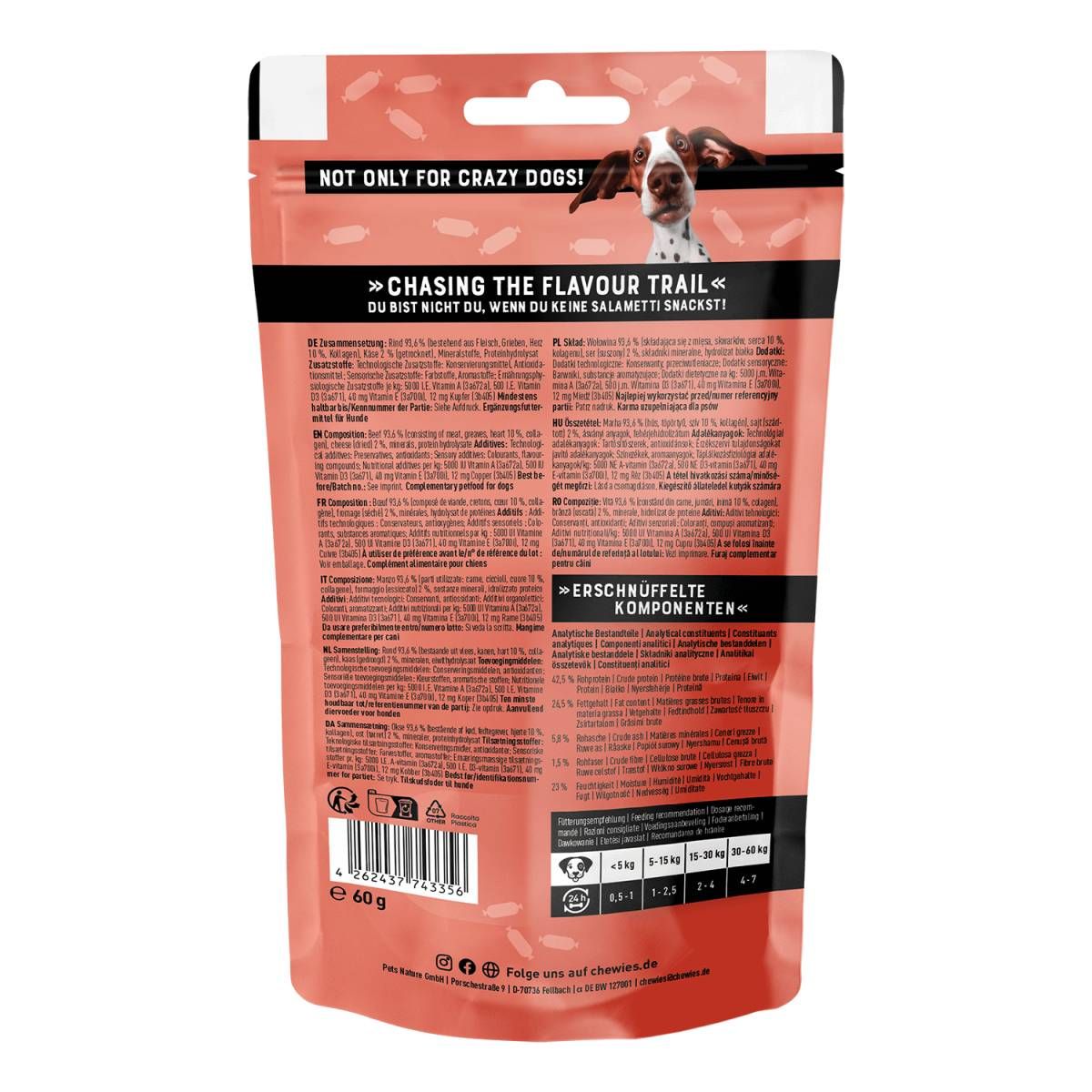 Смачні та поживні ковбаски Chewies Salametti з яловичиною, серцем і сиром – ідеальне частування для вашого собаки! Поєднання високоякісного м’яса, субпродуктів та ароматного сиру створює неперевершений смак, який сподобається навіть вибагливим улюбленцям. Без штучних добавок, барвників і консервантів – тільки натуральні інгредієнти для здорового раціону.