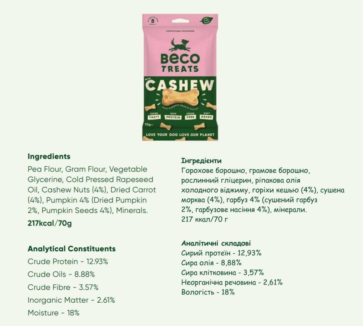 Печиво для собак Beco Pets Кеш'ю з гарбузовим насінням і морквою 70 г (рослинний білок)