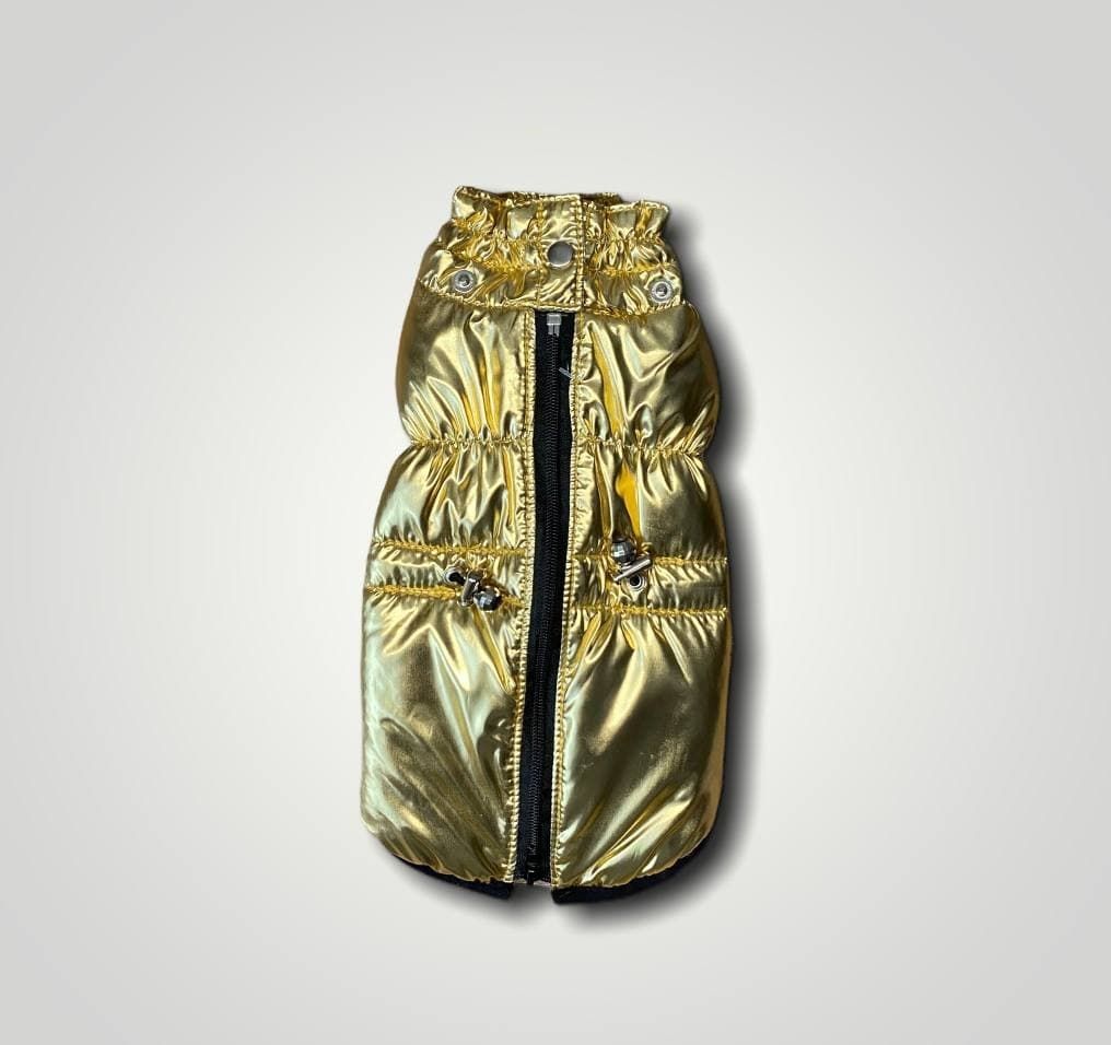 Демісезонний жилет кольору золото.Жилет для собак маленьких, середніх і великих порід.Наповнювач силікон.Зручна блискавка по спинці.Знімний капюшон.