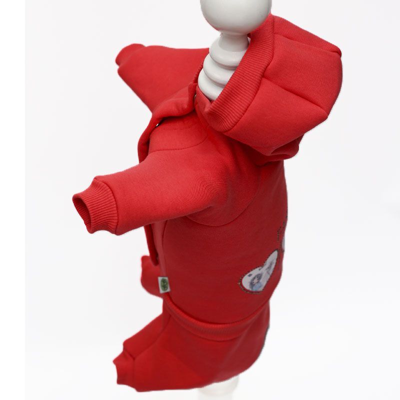 Джулія комбінезон для собак дівчаток з трикотажу на флісі Застібка кнопки. На капюшоні, манжетах і талії трикотажна гумка. На спинці накат з волого і термостійкою плівки.