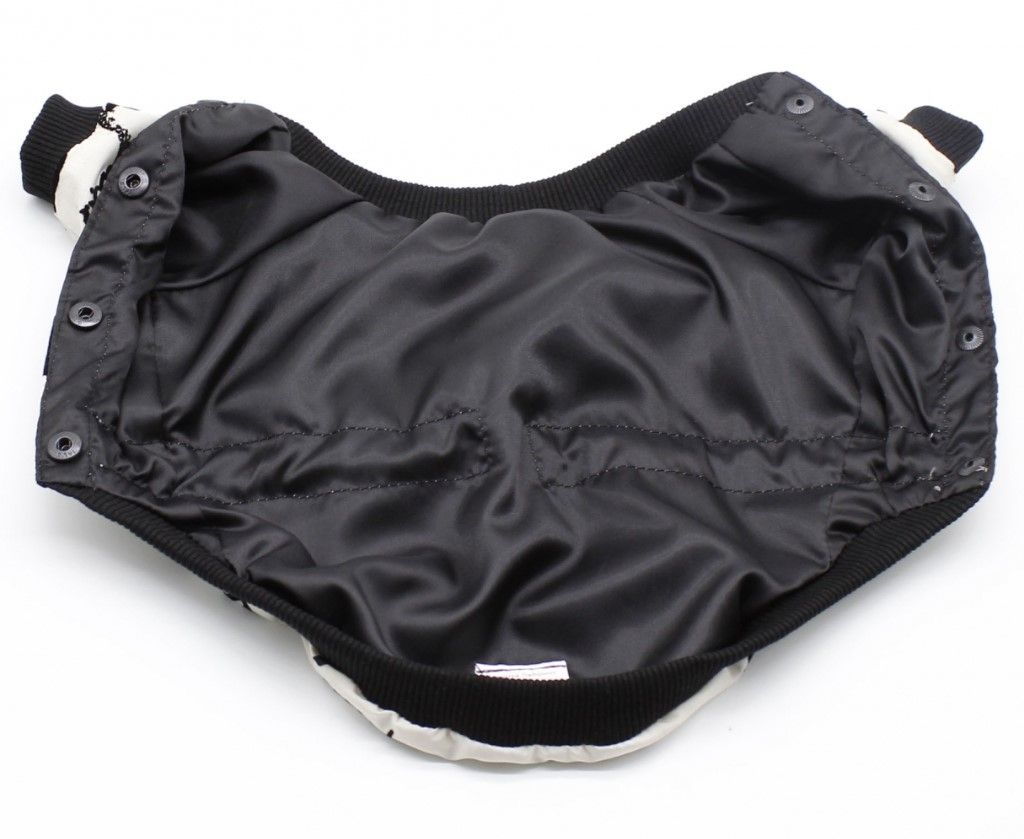 Шовкова підклада, куліса утяжка для найкращоі фіксаціі, манжети та ворот з кашкорсе, застібка кнопки.РозмірПородаДовжина спини, смОкружність грудей, смВага тварини, кгXXSЙоркширський терєр, той-терєр, чихуа-хуа, цуценята18-22 см25-31 смдо 1,4XSЙоркширський терєр, той-терєр, чихуа-хуа23-25 см32-40 смдо 2,2SЙоркширський терєр, той-терєр, чихуа-хуа26-29 см40-45 смдо 3S1Йоркширський терєр, пекінес (маленький), безпородні30-33 см40-46 смдо 4,5S2Пінчер, йоркширський терєр, пекінес, цуценята26-29 см46-57 смдо 4,5S3Мопс (маленький), ши-тцу, пекінес30-33 см46-57 смдо 6МТакса міні, чубата собачка, пудель, ши-тцу, фокс-терєр, безпородні33-37 см41-53 смдо 7М1Мопс (середній)31-37 см51-68 смдо 10LТакса (середня), спанієль дрібний38-43 см47-58 смдо 9L1Французький бульдог, мопс великий, спанієль середній38-43 см59-70 смдо 12XL1Боксер, спанієль, стаффордширський терєр50 см50-58 смдо 25XXLСтаффордширський терєр, такса54 см52-63 смдо 35XXL1Стаффордширський терєр50-55 см75-95 смдо 50XXXLРетривер, доберман, лабрадор, вівчарка, ротвейлер56-69 см85-105 смдо 60