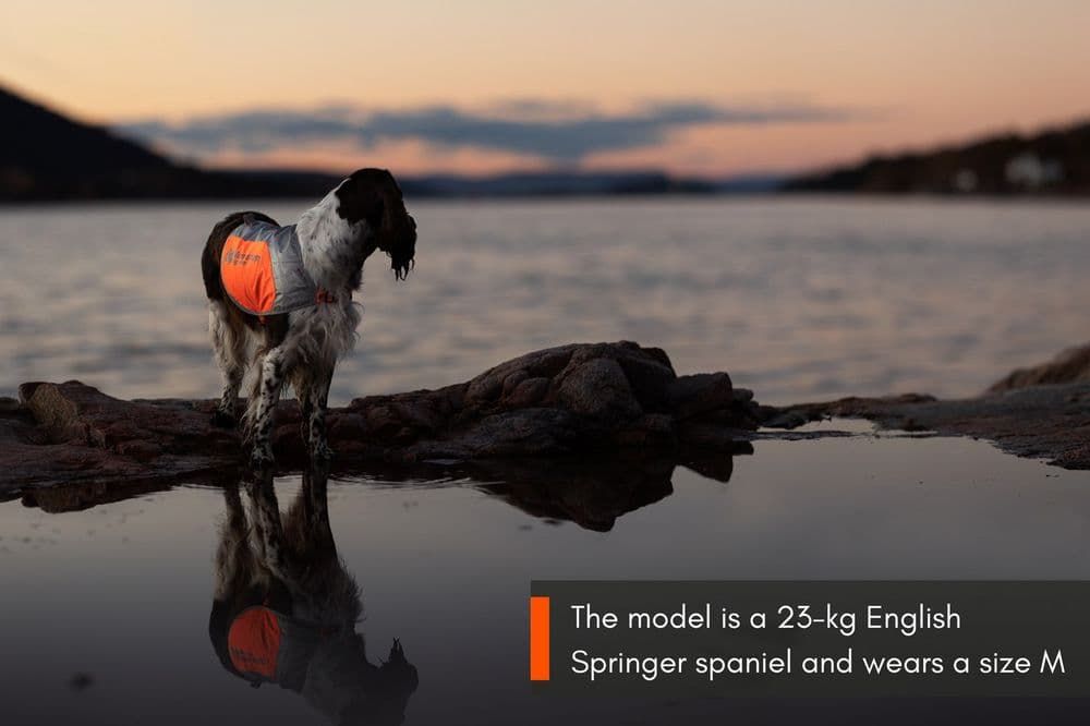 Відображення рятує життя, оскільки значно покращує видимість для інших. Ковдра Reflection являє собою комбінацію помаранчевого матеріалу високої видимості та потужного світловідбиваючого матеріалу 3M, який робить собаку помітною в темні дні восени та взимку, забезпечуючи додатковий захист як для вас, так і для вашої собаки. На тильній стороні є світловідбиваючий клапан, який видно з усіх кутів. Передній ремінь також світловідбиваючий.