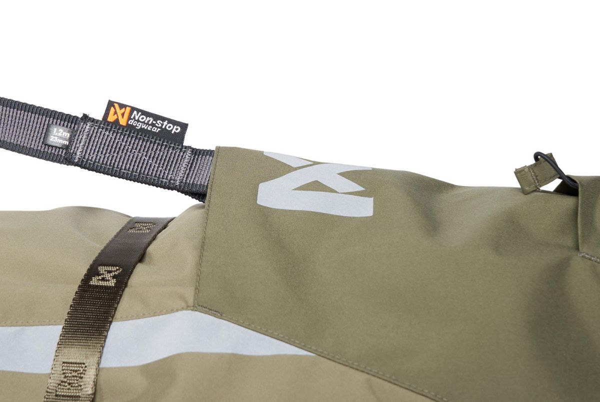 Продумані деталі підсилюють функціональність: дренажні отвори запобігають накопиченню води, подвійні отвори для повідця додають універсальності, світловідбивальні елементи покращують видимість у темряві, а посилені панелі захищають від гілок і рослинності. Еластичні задні ремінці допомагають зберігати ідеальне положення куртки навіть під час бігу чи сильного вітру.