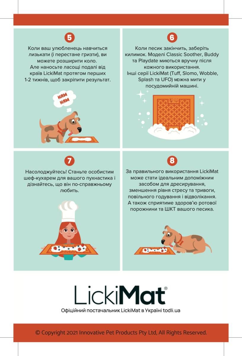 - Будь ласка, спостерігайте за улюбленцем в перші кілька разів використання LickiMat, поки не переконайтеся, що він не жуватиме килимок;