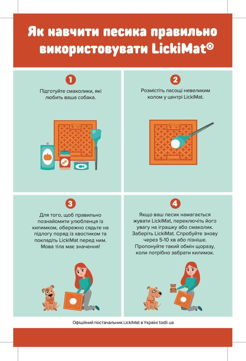- Будь ласка, спостерігайте за улюбленцем в перші кілька разів використання LickiMat, поки не переконайтеся, що він не жуватиме килимок;
