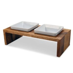 Основу виготовлено з відновлюваної натуральної деревини, отриманої з екологічно чистої плантації. Забарвлення виконане з використанням олії, без застосування хімічних барвників, що забезпечує безпеку для тварин та навколишнього середовища. Знімні миски для їжі виконані зі 100% кераміки. Через круглу форму вони особливо підходять для собак із плоскими мордами, таких як мопси або бульдоги.